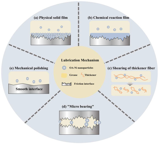 Schematic of the lubrication mechanism of OA-Ni nanoparticles as an additive in various greases.