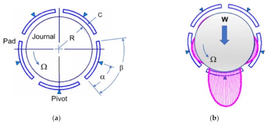 Geometry and loading of a tilting-pad bearing: (a) concentric pads and journal, non-operational; (b) operating bearing.