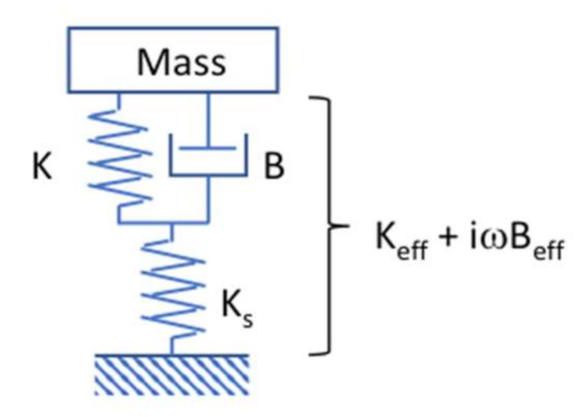 Consider a simple analog to the journal/pad model with an intermediate massless degree of freedom (DOF), vibrating harmonically at frequency ω, as shown in Figure 2. The mass is connected to a stiffness K and a damper B, and with a support stiffness KS. The objective is to investigate the overall dynamic characteristics of the structure connecting the mass to ground. The key is to eliminate the massless DOF, and thus determine an effective, harmonically based connection impedance () between the mass and ground.