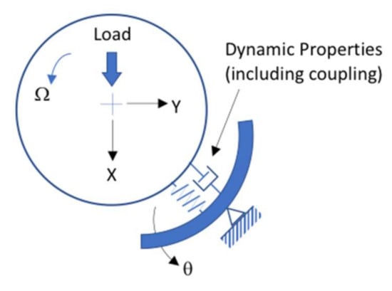 where the B values indicate damping and the K values are stiffness. The XX subscripts represent values that are “direct”, denoting, for example, the ratio of a change in X force to a change in X displacement or velocity. The Xθ or “cross-coupled” subscripts describe the ratio of a change in X force to a change in θ rotational displacement. The force is an externally applied force; most often, a force due to unbalance. A similar equation for the pad dynamics is found to be:
