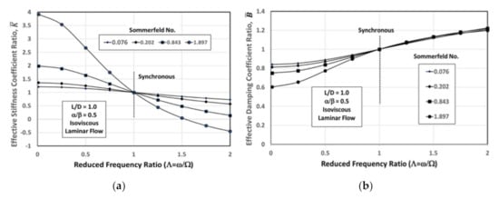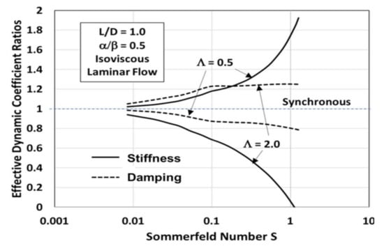 In order to gain a different perspective, the same results plotted in Figure 4a,b have been replotted versus the Sommerfeld number in Figure 5 for two reduced frequency ratios generally significant to rotordynamicists: Λ = 0.5 (half-frequency whirl) and Λ = 2.0 (2X vibration). It is clear that as the “load” reduces, the stiffness values deviate further from synchronous stiffness, but the damping varies less in proportion to the synchronous damping.