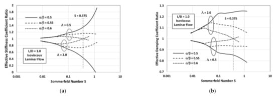 Comparison of the coefficient results uses a coefficient ratio. The nonsynchronous results (and ) are computed using Equations (6) and (7), then divided by the effective synchronous results (, ), and plotted as stiffness and damping ratios (i.e., and ). Recall that these equations have been developed for a single tilting pad, evaluated at an equilibrium position defined by the Sommerfeld number S. Except as noted, the computations have used an arc angle of β = 80° (based on a four-pad TPJB), an aspect ratio (L/D) of unity, and a centrally located pivot (α/β = 0.5). This will be referred to as the “datum” pad.