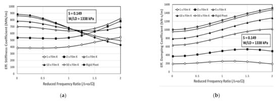 The figures show that decreasing the pivot stiffness also monotonically decreases the effective stiffness for frequencies below synchronous, as do the effective damping coefficients over the entire frequency range considered. All curves also tend to “flatten”, thus moderating the frequency effects. The stiffness curve variations for frequencies above synchronous become more complex.