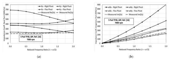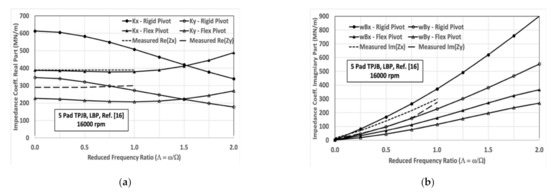 A series of experimental studies by Childs et al. and San Andres et al., some peripherally related, directed toward an understanding of TPJB modeling issues [17,18,19,20,21,22,23,24], examined different styles and configurations of bearings, and except for a few deviations, drew the conclusion that measured damping coefficients do not show frequency dependency, and that the frequency dependency of the impedance real part can be captured with a stiffness term and a term proportional to ω2 (i.e., a virtual “mass”).