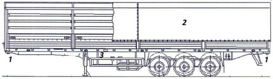 Scheme of a semi-trailer road tractor as a wagon body in the structure of bimodal freight wagon (based on the concept described in [1]); 1—semitrailer seats supported/attached to bimodal bogies, 2—bimodal semitrailer, 3—semitrailer frame.