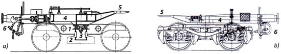 End bogies of a bi-modal freight wagon: (a) with swing bolster; (b) without swing bolster; 1—bogie frame, 2—rocking beam, 3—nest of central pivot, 4—adapter, 5—torque arm, 6—coupling device.