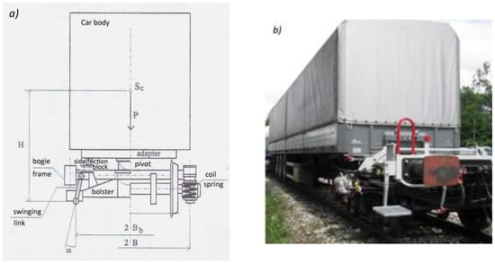 Car body support on freight bogies equipped with swing bolsters suspension: (a) scheme in cross-section; (b) photo of the prototype of the Polish bimodal wagon.