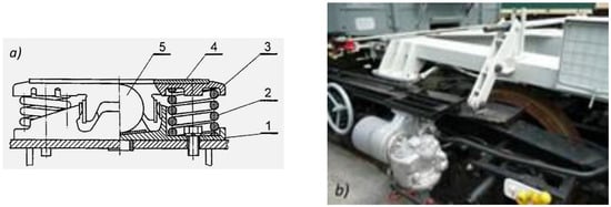 Side friction block with swing bolsters suspension: (a) scheme in cross-section, 1—side slide body, 2—spring, 3—wear plate guide, 4—steel wear plate, 5—steel roller; (b) photo of the prototype of the Polish bimodal wagon.