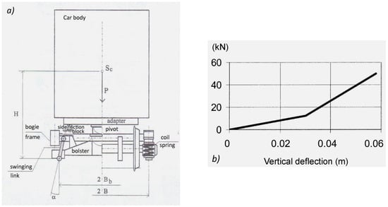 Primary suspension of the bogie: (a) scheme of wheelset axle guidance in the bogie frame; (b) vertical stiffness characteristics of suspension.