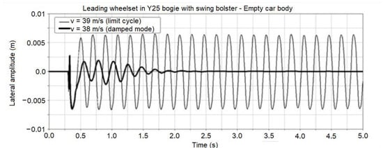 As a result of the study, it was found that the wagon model with bogies equipped with a swing bolster provides a sufficiently high nonlinear critical speed in straight track traffic. For an empty wagon, this speed was equal to 39 m/s (140.4 km/h), while for a fully loaded wagon it was 47 m/s (169.2 km/h). Further computational analyses were made, and it was also found that freight wagon model with bogies without swing bolsters would only be able to achieve comparable critical speeds on the straight track if the lateral and longitudinal stiffnesses of the primary suspension stage reached values of the order of 10,000 kN/m. However, as mentioned earlier, such stiffnesses would cause a huge deterioration in the dynamic properties of the freight wagon when moving on a curved track with a small radius of curvature.