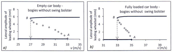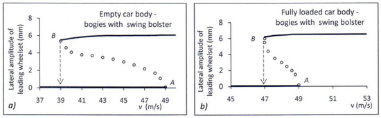 Bifurcation diagrams of leading wheelset behavior in bogies with swing bolster after an excitation for: (a) empty and (b) fully loaded car body.