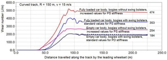 In Figure 9, the results concerning wear numbers of external wheels in a leading wheelset were shown in function of distance travelled along the curved track by the wagon models. The presented results of wheel–rail wear calculations on curved track concern two bogie design solutions, providing freight wagons on straight track with the critical speed of 169 km/h.