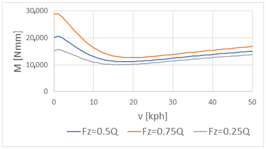 The obtained values of the resistive torque versus wagon speed in the tapered roller bearing are presented in Figure 10, for the case of motion along the straight track (), and along the curved track for the wheel under overloading () and under underloading ().