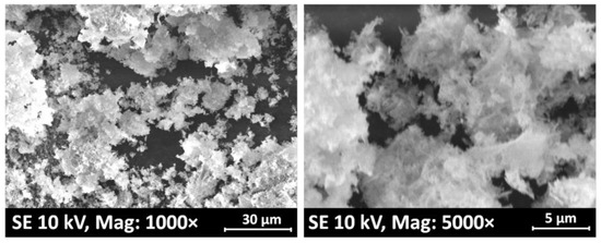 The SEM images of the investigated Y2O3 nanoparticles with 1000× and 5000× magnitude.