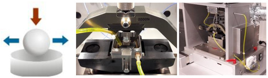 For the experimental investigations, an Optimol SRV®5 type tribometer (Munich, Bavaria, Germany) was used with the specimens of ball and disc. The specification of used specimens is in correlation with the standard of ISO 19291:2016 [16]. A self-developed testing method [17] was used for the experiments with a supplementary oil circuit with an oil flow rate of 225 mL/h. The ball specimen was moved on the flat surface of the disc with a 1 mm stroke and 50 Hz frequency oscillation movement pattern. Both the specimens and the lubricant were heated up to 100 °C temperature separately; 50 N loading force was applied between the surfaces for 30 s and then increased to 100 N for 2 h [18]. The applied testing machine with the realized oil circuit is presented in Figure 4.