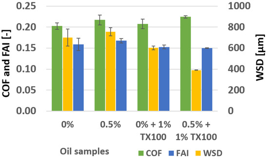 - FAI (friction absolute integral) value: an average value calculated from the area under the friction coefficient values recorded with high frequency, representing the property of the system under mixed and hydrodynamic lubrication regimes. The calculating equation can be observed in (1).
