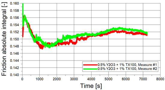 Firstly, the necessity of extra surface-active detergent additive was analyzed. For this, four different lubricant samples were prepared: neat Group III base oil as the reference, GIII doped with 0.5 wt% Y2O3, GIII with 1 wt% Triton X-100, and GIII doped with 1 wt% TX100 and 0.5 wt% Y2O3. The results of this comparison are shown in Figure 6. The results are obvious: yttria without triton in the applied base oil significantly increased the tribological losses, but the nanoparticles supplemented with the detergent TX100 have provided positive tribological values. Both the integral friction coefficient value and the diameter of the wear scar on the ball specimens were remarkably reduced. Figure 7 demonstrates the time dependence of the measured friction coefficient values during the frictional tests and the comparison of two independent measurements with the same nanoparticle concentration. The two measured friction coefficient curves are smooth and nearly linear, which strengthens the statement that the yttria nanoparticles require the presence of triton detergent to provide positive tribological properties. The reproducibility of the measurements is also excellent.