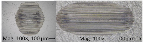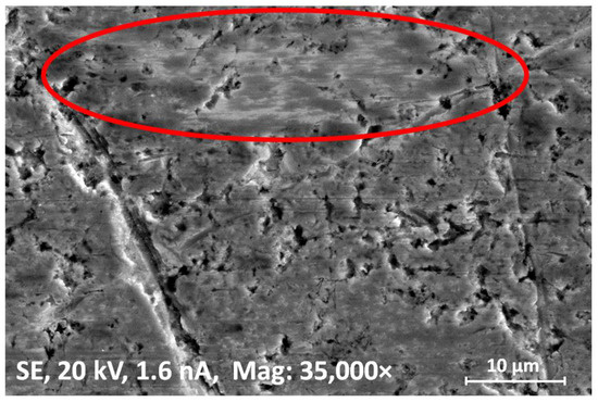 The high-magnitude SEM analysis has also revealed an interesting area which can be seen in the red circle in Figure 18. The surface structure of the original surface cannot be observed despite the very low wear depth. According to the deeper analysis of this area, it can be established that the nanoscale yttria-doped lubricant caused microscopic plastic deformation on the surface. In the highlighted area, no sign of the original surface (grinding grooves) can be observed, which proves that it was produced during the tribotest. No porosity can be observed in the deformed areas because these pores were covered by the plastic deformed materials. The SEM analysis has also revealed that the marked area is bowl-shaped: the middle section of this area shows higher wear depth, while its edge shows lower wear depth.