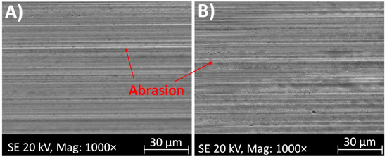 SE—scanning electron microscope image about the surface of disc specimen with triton-doped neat Group III reference oil, (A) middle-stroke, (B) dead-center.