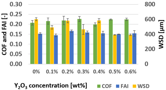 The tribological properties of yttria containing nanolubricants were analyzed with the previously presented ball-on-disc tribosystem. At least three independent tribometer tests were carried out with every yttria concentration including the yttria-free reference oil for the proper statistical evaluation. For the evaluation, COF and FAI values from the last 15 min of each measurement were taken, where the friction coefficient curves are already straightened. The average value and the standard distribution of these values were calculated and plotted for the graphical illustration and evaluation.