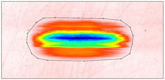 The missing volume of the surfaces represents the antiwear properties of the tribosystem more accurately. During the investigation, the wear volume of the run disc specimens was measured by a confocal microscope. Both the worn area and the original disc surface around the wear area was digitalized by the Leica confocal microscope and the results were evaluated to measure the wear volume. The worn area was enclosed, the average height value of the unworn areas was calculated and the volume under the average height is considered as the wear volume. An example of the analysis of wear volume is presented in Figure 12.