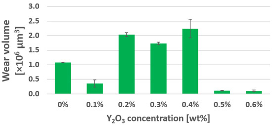 The calculated wear volume values measured for each yttria-concentration are demonstrated on a bar chart in Figure 13. It is clearly visible that both a low concentration (0.1 wt%) and higher concentrations (0.5 and 0.6 wt%) cause very low wear volume on the surface. The optimum concentration according to the wear volume analysis can be established at 0.5 wt%, which resulted in a 90% wear volume reduction. To understand the positive wear reduction properties of yttria nanoparticles, further SEM analysis was carried out which will be introduced in the following paragraphs.