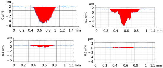 Cross-section diagrams can be produced from the digitalized surface data as well. These cross-section diagrams enable us to analyze the wear depth in specific areas. Figure 14 represents the results of cross-sections at three different yttria concentrations compared to the reference, yttria-free measurement. The 0.5 wt% result clearly proves the positive antiwear properties of yttria, because both the wear volume and the wear depth was significantly reduced, compared with the reference.