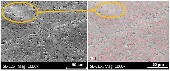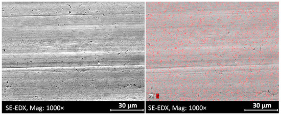 Figure 16 represents the results of the SEM-EDX analysis of the worn surface of the disc specimen with 0.5 wt% yttria-doped lubricant sample. The acquired SEM image clearly illustrates the low wear status: the original disc surface structure can be observed in the SEM images as well. This low wear rate correlates with the acquired cross-section profiles (Figure 14, 0.5 wt%) too, where the mean wear depth was significantly below 1 µm. On the worn surface, a significant amount of yttrium element was found, which represents the presence of yttria nanoparticles attached to the surface. However, the SEM-EDX analysis also reveals several tiny areas with significantly lower yttrium distribution, such as the orange-marked area in Figure 16.