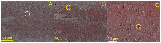 Multiple high-resolution SEM images including EDX element analysis were recorded to receive further detailed information about the distribution of the yttria on the worn surface of the disc specimen. Figure 17 represents the recorded BSE images; the yttrium signals were marked with red color. It can be clearly stated that the distribution or the yttrium element on the surface is quite homogenous; however, several areas show yttrium enrichments. These areas were marked on the images, and they were further analyzed.