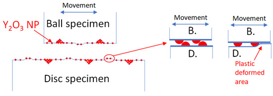 The significant amount of yttrium element increases on the surface and its distribution states for the working mechanism of the yttria nanoparticles: the particles can attach to the connecting surfaces forming a protective layer and fill up the roughness and wear grooves (yttrium-enriched areas were defined by the SEM-EDX images) resulting in a smoother contact between the rubbing surfaces. This mechanism is called mending (see in Figure 1b)). Additionally, the yttria nanoparticles were also pushed into the metal matrix forming a protective tribofilm, called as tribo-sintering (see in Figure 1d)) mechanism. The working mechanism of tribo-sintering was already proved in previous studies of researchers in case of nanoparticles from other materials (e.g., CuO, ZrO2 and ZnO Hernandez Battez et al. [24], and Fe2O3, SnO2, CuO and Bi2O3 by Kato et al. [25]).