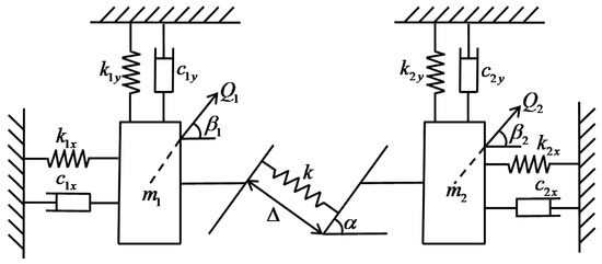 As shown in Figure 1, in the working condition of the turbine blades, the blades will undergo contact-separation transition and stick-slip transition due to the bending vibration in both and directions. In the contact state, the impact and dry friction occurs in the contact surface. In engineering practice, the shrouded blades vibrate in a three-dimensional direction which is very complicated. In this paper, the bending vibration of the blade in direction and direction is discussed, while the bending vibration in direction, which is very small in comparison to that in and direction, and the torsional vibration is not considered for simplicity. Based on the analysis above, a spring-mass model of the structure in Figure 1 can be set up and shown in Figure 2.