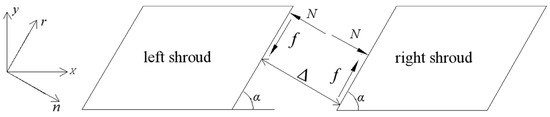 Due to the symmetry characteristics of the shrouded blades, some parameters of the two blades are consistent. So: , , , , , , . Equation (2) can be expressed as: