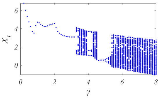 Bifurcation diagram of versus based on the bilinear hysteresis model.