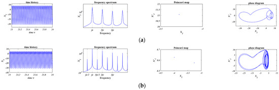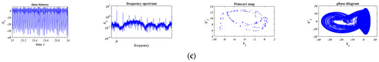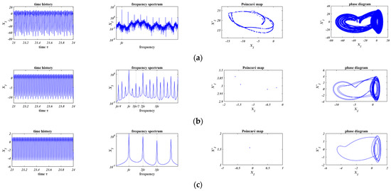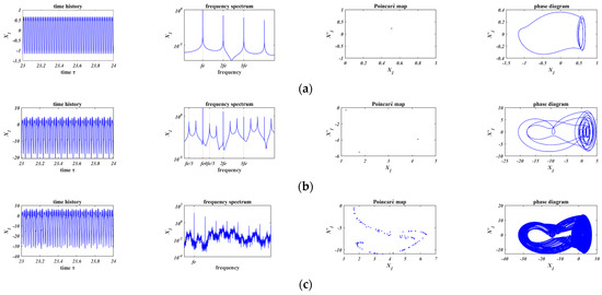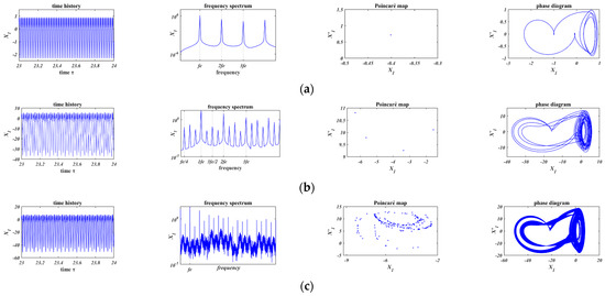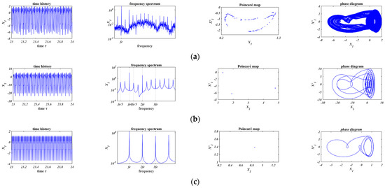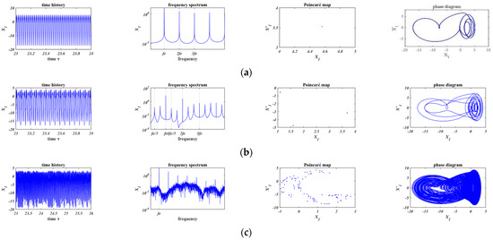 In Figure 11a and Figure 12a, when , chaos occurs in both of the two friction models. Comparing Figure 11b with Figure 12b, based on the Coulomb friction model (Figure 11b, ), the motion is period-4 motion whose minimum period is four times of the external force; based on the bilinear hysteresis model (Figure 12b, ), period-3 motion occurs and the minimum period is three times of that of the external force. In Figure 11c and Figure 12c, when , the motions are both period-1 motion.