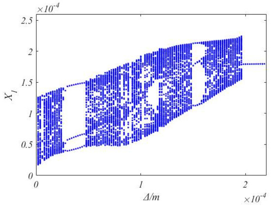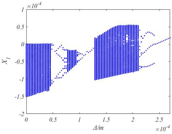 The bifurcation diagram of versus with the Coulomb friction model and the bilinear hysteresis model is shown in Figure 9 and Figure 10, respectively. Based on the comparison of the two Figures, as increases bifurcation phenomenon occurs with different initial gaps and the bifurcation characteristics of the system are not consistent.