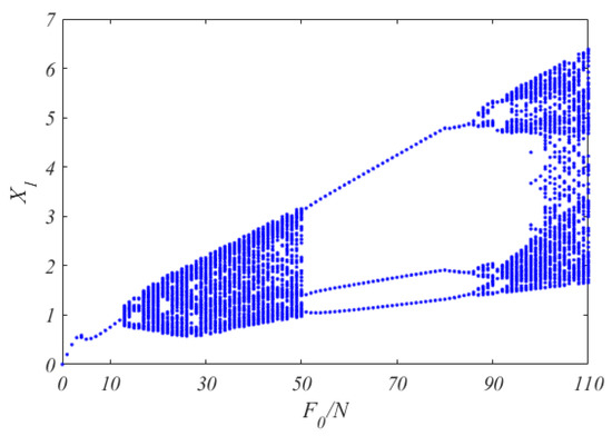 Figure 13 and Figure 14 separately show the bifurcation diagram of versus with the Coulomb friction model and the bilinear hysteresis model. Comparing the two Figures, the bifurcation phenomenon occurs at different values of the excitation force amplitude and it shows different bifurcation characteristics with the increase of .