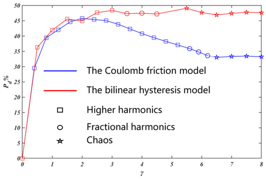 In Figure 17, with the increase of , the responses follow a sequence of period motions with higher harmonics, period motions with fractional harmonics and chaotic motions. With the Coulomb friction model, initial increases to the optimal value, then decreases significantly and tends to be stable; in contrast, with the bilinear hysteresis model, first increases and then keeps stable basically. Based on these two models, the stiffness ratio corresponding to the optimal vibration reduction effect of the system is different. Compared with the bilinear hysteresis model, prediction of the vibration reduction effect of the system based on the Coulomb friction model is generally conservative. When the stiffness ratio increases to some extent, the simulation results of based on these two friction models are obviously different.