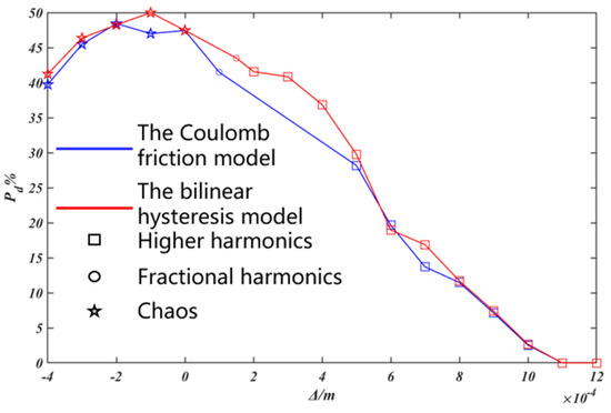 In Figure 18, with the increase of , chaotic motions, period motions with fractional harmonics, and period motions with higher harmonics appear successively in the responses. When the initial gap is negative, it is equivalent to giving a preset positive pressure to two shrouds. As the absolute value of gradually decreases, that is, the preset positive pressure gradually decreases, gradually increases. When Δ is positive, keeps decreasing with the increase of the value of . When Δ increases to some extent, it is difficult for the two blades to contact with each other, and tends to be zero. Based on these two models, the initial gap corresponding to the optimal vibration reduction effect of the system is not accordant. Compared with the bilinear hysteresis model, prediction of the vibration reduction effect of the system based on the Coulomb friction model is generally conservative. The simulation results of based on these two friction models are obviously different in certain initial gap bands.