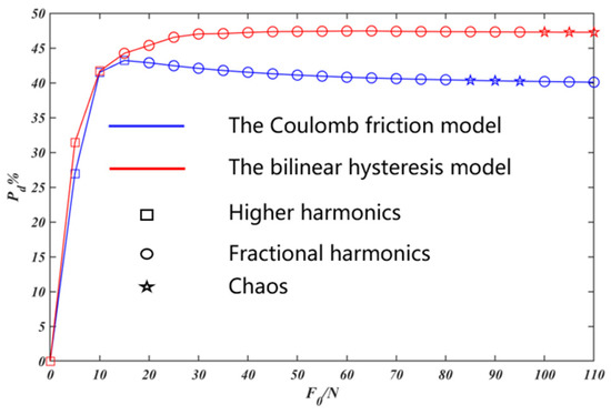In Figure 19, with the increase of , there are period motions with higher harmonics, period motions with fractional harmonics and chaotic motions successively. With the Coulomb friction model, initially increases to the optimal value, then decreases slightly and tends to be stable; by contrast, with the bilinear hysteresis model, first increases and then keeps stable basically. Based on these two models, the amplitude of the excitation force corresponding to the optimal vibration reduction effect of the system is different. Compared with the bilinear hysteresis model, prediction of the vibration reduction effect of the system based on the Coulomb friction model is generally conservative. When the amplitude of excitation force increases to some extent, the simulation results of based on these two friction models are obviously different.