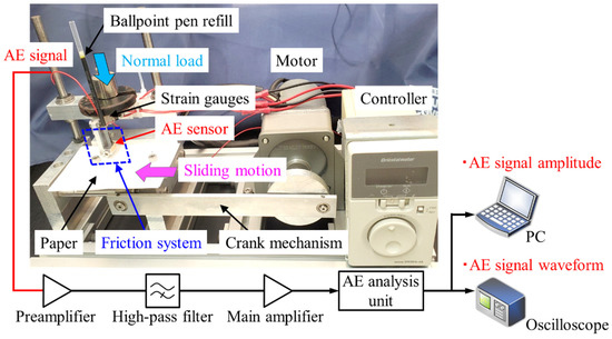 At the time of contact, deformation, and fracture of surface asperities at the frictional interface of a material, acoustic emission waves (AE waves) are generated as elastic strain energy is released. By measuring the AE waves generated under tribological phenomena, it is possible to measure and evaluate the state of friction, wear, and lubrication at the frictional interface in situ [7,8,9,10]. One study on AE waves and writing instruments reported that it is possible to evaluate the tone of drawn lines by measuring the AE waves generated during writing with a mechanical pencil [11]. On the other hand, as far as the author knows, there has been no study on using AE waves to evaluate the writing performance of a ballpoint pen.