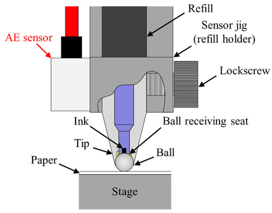 Schematic diagram of the friction system in a ballpoint pen and the AE sensor position.