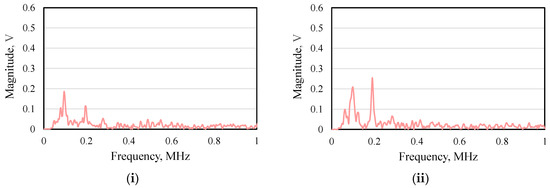 With AE sensing, it is possible to identify and discriminate deformation and fracture phenomena by analyzing the frequency of the AE signal waveform [13]. Therefore, the frequency of the AE signal waveforms detected during writing in Figure 5 when it was stable (when small-amplitude AE signals occurred) and when it was unstable (when large-amplitude AE signals occurred) were analyzed. Figure 6 and Figure 7 show the results for (a) the common oil-based ink and (b) the special oil-based ink, respectively. In the stable state (i), a frequency peak was confirmed around 0.1 to 0.2 MHz (low-frequency range). On the other hand, in the unstable state (ii), a large frequency peak was confirmed not only in the vicinity of 0.1 to 0.2 MHz but also in the vicinity of 0.2 to 0.4 MHz (medium-frequency region).