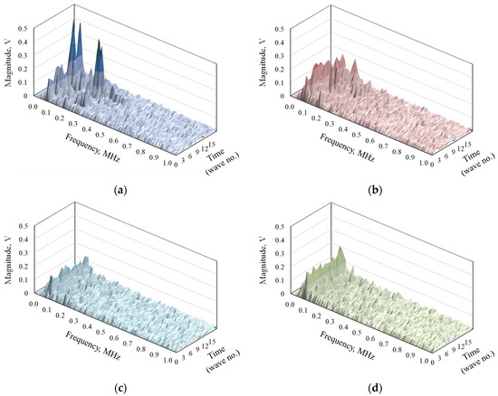 Figure 8 shows the change in frequency of the AE signal waveforms at various times in each experiment. The seventeen spectra of the AE signal waveforms detected during writing are arranged in chronological order. It can be seen that the AE signal amplitude increases in the order of (c) water-based ink, (d) gel ink, and (a) oil-based ink. This is consistent with the order of good writing performance by general ink type. From the AE signal measurement in the sliding friction experiment under the lubricated condition, it is known that the change in friction state due to the film thickness ratio can be detected with high sensitivity [14]. For instance, immediately after large-amplitude AE signals occurred (as seen at 0.5 s for special oil-based ink in Figure 5), the thickness of the line tended to be slightly thinner from the magnified observation of the writing line. Therefore, the frictional state between the ball and the ball-receiving seat due to changes in viscosity and the amount of exudation of the ink is captured.