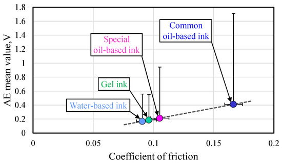 Figure 9 shows the relationship between the coefficient of friction obtained in the experiments using ballpoint pens with different ink types and the AE mean value, which is the average value of the AE signal amplitude. This coefficient of friction, which involves not only sliding friction but also rolling friction between the ball and the paper, was obtained by dividing the average value of writing resistance by the writing pressure. The error bars in the coefficient of friction and the AE mean value represent the standard deviation, ±σ and +σ, for the signal change during the experiment, respectively. The results show a linear relationship between the AE mean value and the coefficient of friction. The correlation coefficient for the regression line was 0.99. Although it is necessary to clarify the effects of writing pressure and writing speed on this relationship, the results suggest that the writing performance of a ballpoint pen can be quantitatively evaluated by AE sensing.