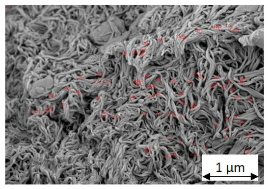 SEM image of the grease with PAG as base oil and 15 wt % lithium 12-hydroxystearate as thickener. The red lines are the selected and evaluated filament diameters.