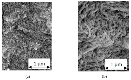 SEM images of the greases with 15 wt % lithium 12-hydroxystearate as thickener and mineral oil as base oil: (a) base oil viscosity ηMO = 0.12 Pas; (b) base oil viscosity ηMO2 = 2 Pas.