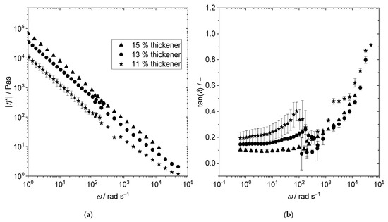 The loss factor (Figure 5b) in the low frequency range decreased with increased thickener concentrations, i.e., the contribution of elastic properties increased, indicating that the thickener filament network became stiffer, and its crosslink density increased, which can be concluded from the increase in the value of the shear modulus.