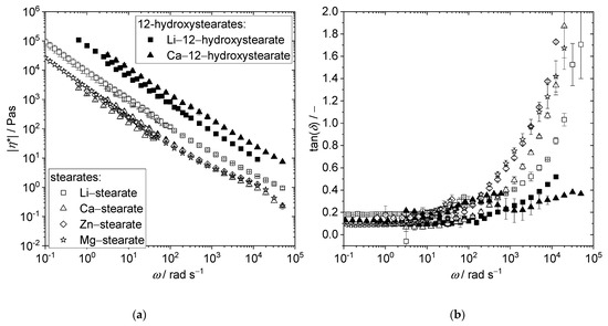 Figure 7b shows the frequency-dependent loss factors of the different greases. In the low frequency range, the elastic response due to the filament network dominated and tan(δ) values were below 0.2, whereas in the high frequency range, the viscous contribution of the oil became increasingly dominant.