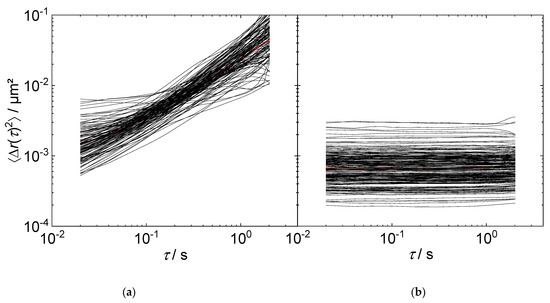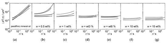 The mean square displacements (MSDs) of tracer particles in the paraffinic mineral oil (MO) shown in Figure 9a are time-dependent and, on average, increased linearly with lag time τ, which means that the particles diffused freely. The complex viscosity |η*|MPT determined from the MSDs agreed well with the complex viscosity determined from rotational rheometry (|η*|RVM = 0.12 Pa s, |η*|MPT = 0.1 Pa s).