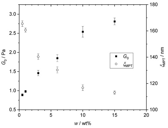 The mesh sizes of the grease structures obtained from the SEM images (ξREM = 114–405 nm) were smaller than or equal to the diameter of the tracer particles (dTracer = 366 nm) used for the MPT measurements. It may therefore be assumed that the tracer particles perceived a homogeneous environment. Therefore, from the moduli determined by MPT (Figure 11), the mesh size may be determined according to Equation (8). With increased thickener concentrations, higher shear moduli G0 and thus smaller mesh sizes resulted; absolute values varied from 165 nm at 0.5 wt % thickener to 113 nm at 15 wt % thickener concentrations.